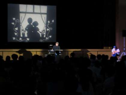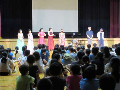 7月30日から8月3日に開かれる「第4回とやま世界こども舞台芸術祭」のプレ公演を、5年生と6年生が鑑賞しました。洋楽演奏では、弦楽器の音色を味わいながら色々な曲想のアンサンブルを楽しみました。影絵パフォーマンスでは、英語も交えた楽しいストーリーがギター演奏と共に影絵に映し出され、子供たちは興味津々な様子で楽しんでいました。マスコットキャラクターのPATちゃんも登場して、子供たちも来月開かれる芸術祭に興味をもったようです。