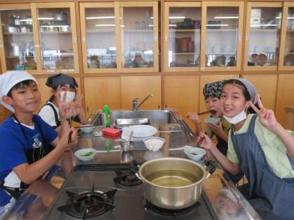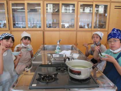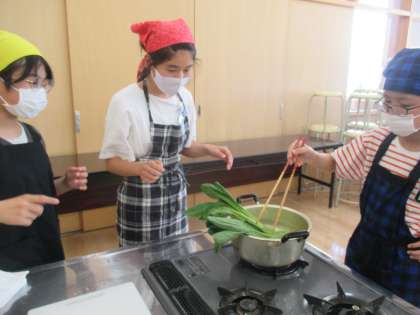 青菜をゆでる調理を行いました。手順をしっかりと確認し、火や包丁の扱いに気を付けながら、安全に調理していました。自分たちで作った小松菜のおひたしを食べ、笑顔の子供たちでした。