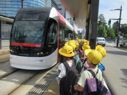 昨日の1,2組に続き、今日は3組が県庁前から市内電車(環状線)に乗り、富山市立図書館(キラリ)に行ってきました。図書館では、キラリにある本やイベントについてのお話を聞き、読み聞かせをしていただきました。
