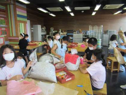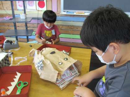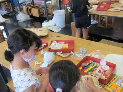 今日の図画工作の学習は、楽しみにしていた「くしゃくしゃぎゅっ」の作品をつくりました。大きな紙袋の中に新聞紙を入れ厚みをもたせ、ふくらませたり、つぶしたり、丸めたりしながら、形を変えていき、思い思いの生き物に変身させます。抱きしめたり、話しかけたり、名前を付けたりと、愛着をもって作品づくりに夢中になる姿が見られました。