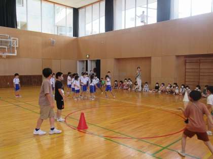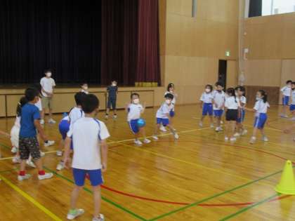 1年生は、2年生とドッジボールの試合を行いました。各クラス代表10名を決め、ボールを投げたり、逃げたりしながら楽しく企画に参加しました。ドッジボールの試合に出場していない子供たちも応援をしながら一緒に盛り上がりました。