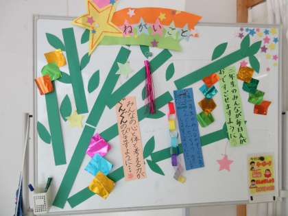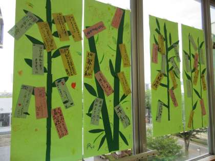 7月7日には、校内のあちらこちらに子供たちの願いが込められた七夕飾りが飾られました。「健康で」「なかよく」「楽しく」また「大きな夢」など、願いを託した短冊の一枚一枚が輝いて見えます。子供たちみんなの願いがかないますように。