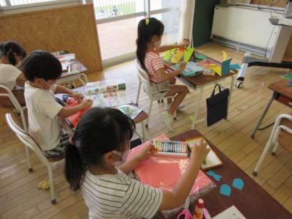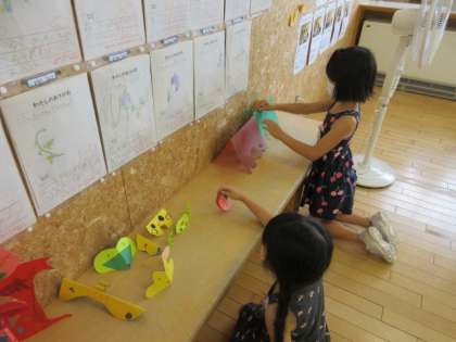 画用紙を折って立ててみると・・。いろいろな折り方や切り方、立たせ方を試しながら、「〇〇に見えるよ」「目をかいたらかわいくなった」と、思いついたものを楽しそうに作っていました。できた作品は、飾って友達同士で見合いました。
