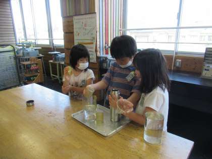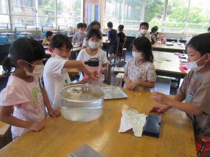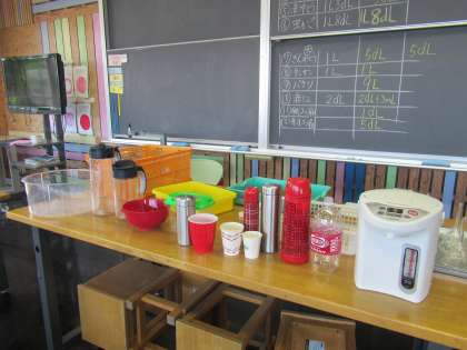 水槽や虫かご、バケツやポットやいろいろな大きさの水筒など・・・。どのくらいのかさかを予想しながら、量りました。入る水の量によって、dLます、Lますを使い分けながら量る活動を通して、容量にあった単位での表し方を考える姿が見られました。