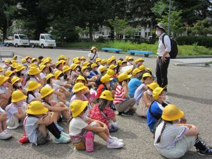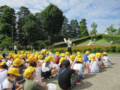 県庁前公園の花時計の植え替え作業が、毎年この時期に行われています。今まで植え込んであった花苗を学校や各家庭で再利用するするために、2年生が花苗をいただきに、県庁前公園に行ってきました。