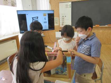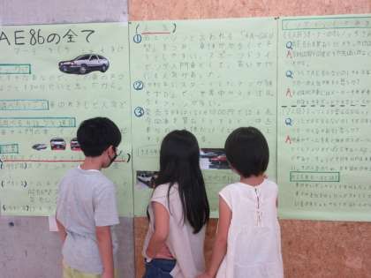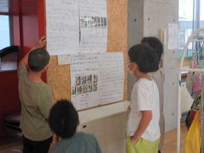 夏休みの自由研究について、「くふうしているね。」「まとめ方が見やすいね。」と友達とよいところを伝え合いました。