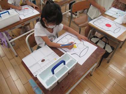 初めて水彩道具を使う子供たちも多く、道具の名前や使い方を学習しながら、楽しんで絵の具で色を塗りました。