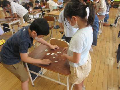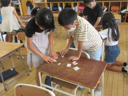 国語科では、漢字をへんとつくりに分けて漢字パズルをつくりました。