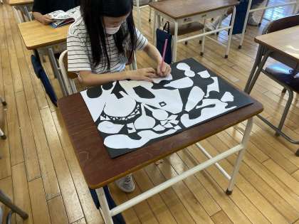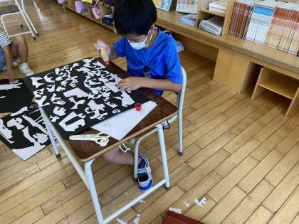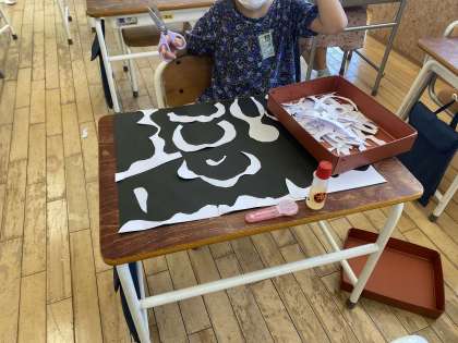 2年生では図画工作科で「はさみアート」に取り組んでいます。はさみを自由に動かしてたまたまできた形をならべて作品を考えます。自由に切った子供たちの作品はとてもおもしろいですね。