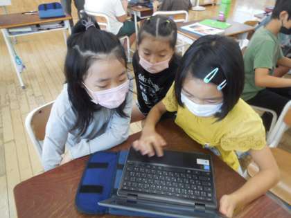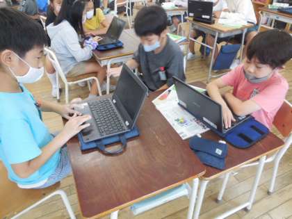 水が空気中に出ていくのかどうかについて実験をしたあと、考察をしています。グループや個人で結果をスライドにまとめています。