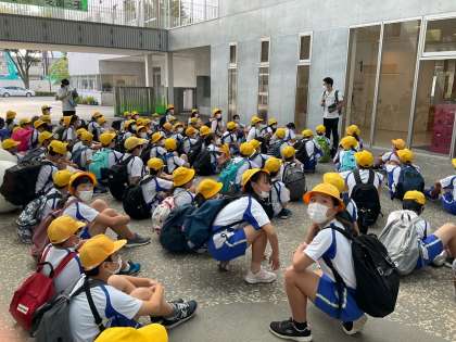 チャレンジ陸上大会に出発です。一度レーンやピットを確認してからバスに乗りました。
