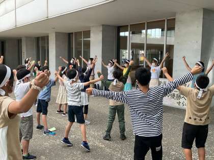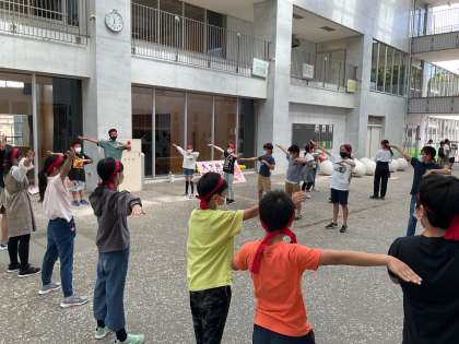今日初めて応援練習を5年生と一緒に行いました。グループ練習を入れるなど工夫をしていました。赤団と白団の様子です。