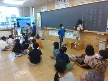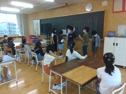 4年生の団体競技は「シバ・タイフーン」です。棒を3人で持って、台風の目のようにコーンを素早く回ります。効率よくコーンを回ったり、できるだけ速く3人で走ったりするためのコツを団で考えました。