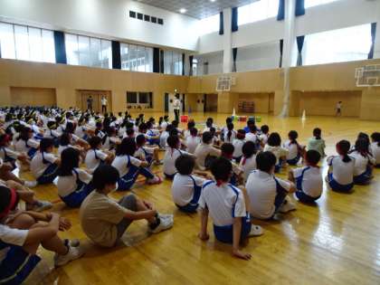 団体競技について説明を受けました。ルールを聞くと、「楽しそう」とつぶやく子供たちもいて、実際にやってみることを楽しみにしている子供たちでした。