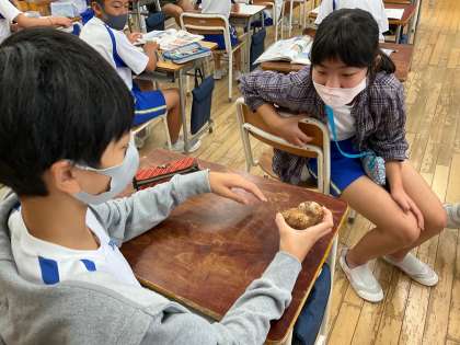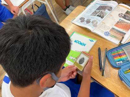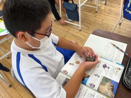 理科の学習で地層の学習をしています。地層の中から発掘されたアンモナイトや三葉虫、れき岩なども化石を見たり触ったりしました。子供たちは目を輝かせていました。