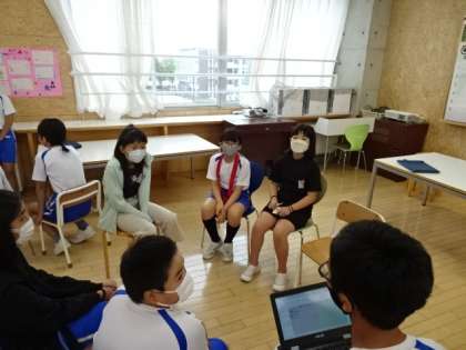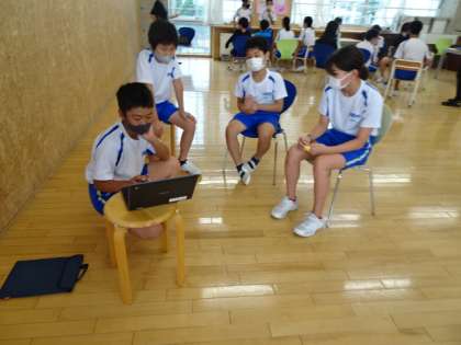 6年生多目的教室で、この日の応援練習に関する内容を打ち合わせました。写真は、赤団・黄団です。