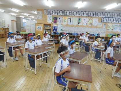 体操服にはちまきを縛り、結団式に参加しました。6年生の団リーダーから発表される各団のスローガンや、校長先生から団旗を手渡される様子を見て、ますます運動会への意気込みを高めました。