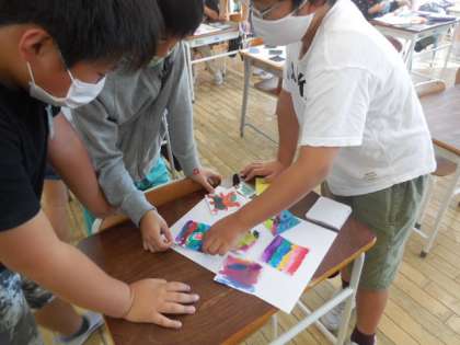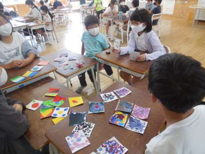 色の重なりや混ざり具合からイメージできることを、お互いに伝え合う活動をしました。「なんか暖かい感じがするね」「ブラックホールみたいだ」など、自由な発想で作品を見合うことができました。そのあとは、台紙に貼り、作品に仕上げました。