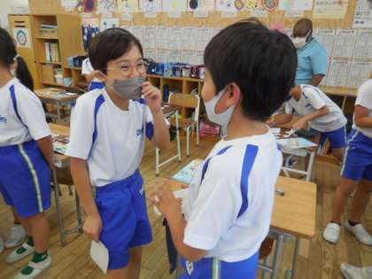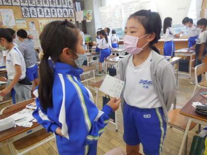 最終回は、紙にかいた文房具を友達にプレゼントする活動を行いました。「目を見て会話をしよう」「『ハロー』など、知っている英会話も使ってコミュニケーションをとってみよう」など、一人一人が目当てをもって取り組みました。