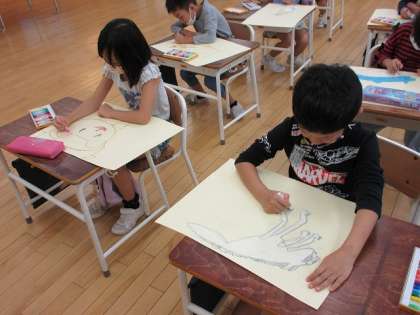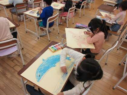クレヨンを使って、乗りたい生き物を大きく描いたり、丁寧に塗ったりしています。