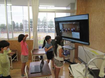 6年生がつくってくれた応援の動画を見ながら、まねをしたり、一緒に声を出したりして練習しました。各団、気合いが入っています。