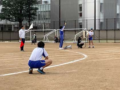 運動を盛り上げる放送や、「位置について、バン」のスタートの合図でも、6年生が、頑張っています。
