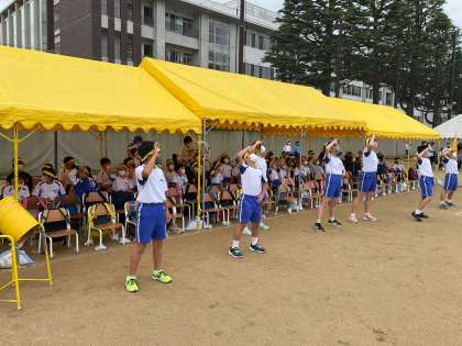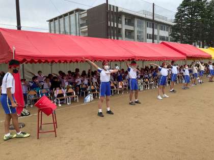 各団の団席の応援にも力が入ります。赤団と黄団の様子です。