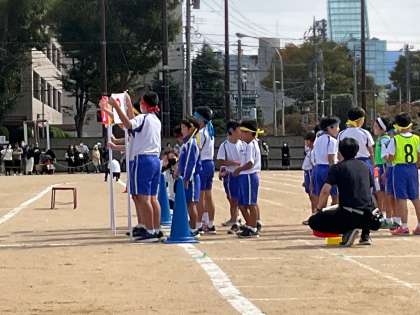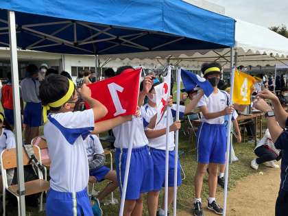 順位を知らせる旗を運ぶ仕事も6年生が担当しています。向きを確かめながら、仕事をしました。