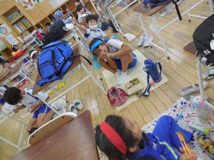 競技を終え、教室に戻った子供たちの楽しみは、お弁当。家の人が作ってくれた愛情たっぷりのお弁当を美味しそうに食べていました。午後も、がんばれそうです。