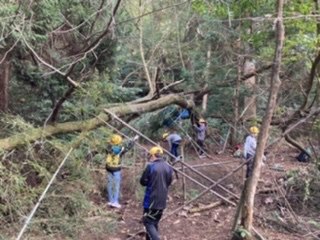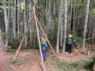 森の家づくりは竹林で竹を切り、木と結んだり、竹と竹を紐で結びつけたりして自分たちの秘密基地を作っています。
