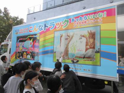夏休みの作品応募の中にあった、「こんなトラックあったらいいな」小学生絵画コンクールで優秀賞に選ばれた子供の作品が、実際にトラックにラッピングされて学校にやって来ました。友達のがんばりを目にして、みんな嬉しそうでした。