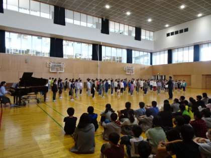 今日は、4、6年生の前で区域連合音楽会で歌う曲「この星に生まれて」を披露しました。子供たちは緊張しながらも、もてる力を出し切りました。歌い終わった後、体育館は拍手に包まれました。