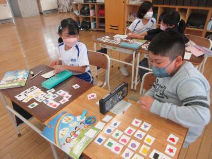 "What do you want?" "One circle, please."と、必要な形を尋ね合う表現に慣れ親しみながら、楽しく活動できました。