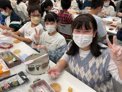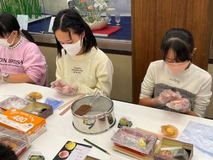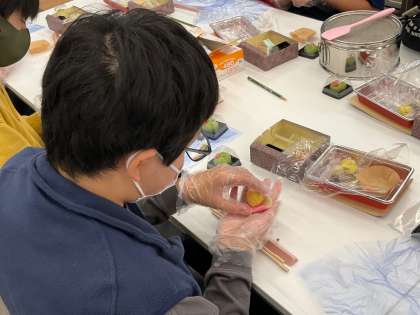 一品目の、深い緑色が美しい「千両」が完成し、二品目の「つばき」を作っています。ピンクと白の優しい色合いです。餡を包む工程は難しいのですが、きれいに作ろうとがんばっています。