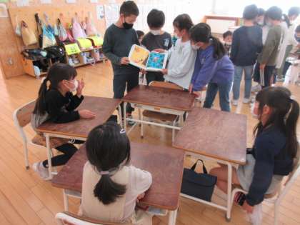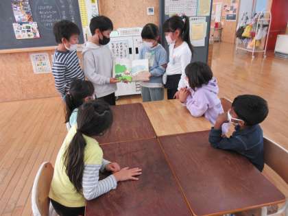 国語科「はんで意見をまとめよう」の学習では、1年生が本を好きになるような読み聞かせをしようという目的をもって班での話合いを重ね、読み聞かせする本を決めました。1年生にしっかりと伝わるように練習も行い、本日、読み聞かせを行いました。