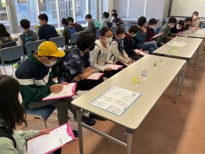 6年生は、卒業制作で、ガラスのペーパーウェイトをつくりに、富山ガラス工房に行きました。説明を聞きながらデザインを考えていきます。