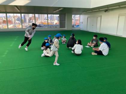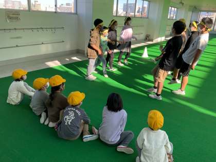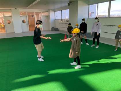 六年生が国語科の時間に話し合って企画した一年生との交流が実現しました。一年生と仲良くなるために、ハンカチ落としをしながらしりとりをしたり、六年生と一年生の走る速さに差が出ないように六年生はケンケンをしたりするなど、ルールを工夫しました。はないちもんめをすることで互いに名前を覚えられると考えた団もありました。六年生が手本を見せながら楽しく遊びました。