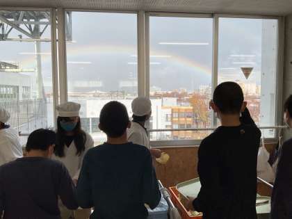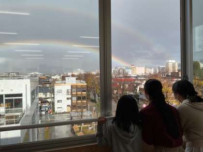 給食の準備中、虹が出ていることに気づきました。さらに、虹は二重にかかっていました。給食当番も思わず振り向くほどの美しさで、午前中にテストを頑張った子供たちの心を明るく晴れやかにしてくれました。