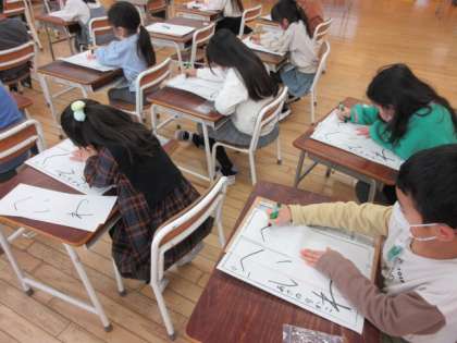 書き初めの練習を始めました。「へいわ」の文字を書きます。硬筆ずみを使って、お手本を見ながらゆっくり丁寧に書いています。