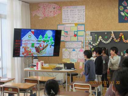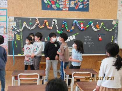 2学期最後のお楽しみ集会の冬の学級集会を学級で行いました。お楽しみ係が企画した「ブラックサンタ鬼ごっこ」と「すごろくゲーム」、音楽係と運動係が企画した「冬のコンサート」を楽しみました。協力してプレゼントを作ったり、飾り付けをしたりして学級の全員で準備を短時間で行うなど、集会を成功させようと一生懸命活動しました。笑顔、思いやりいっぱいの心温まる素敵な集会になりました。