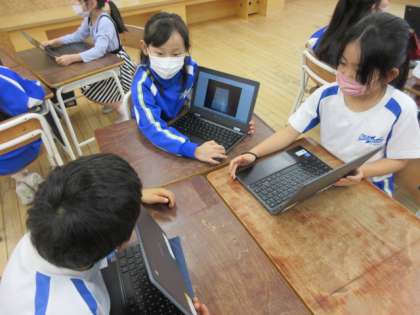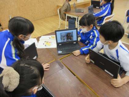 国語科の学習では、自分の好きなものについて、クロームブックで撮った写真を見せながら、友達に話しました。「名前は何といいますか」「どんなところが好きですか」など、もっと知りたいことを質問しました。友達の好きなものが分かって、嬉しそうな子供たちでした。