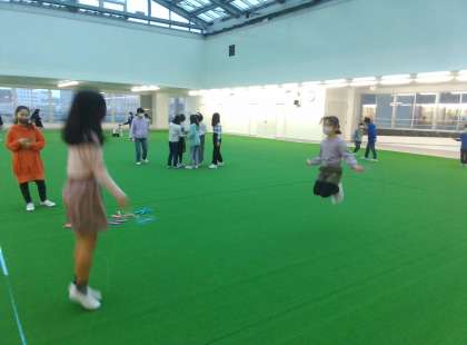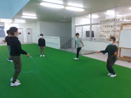 今日は天気が悪く、プール室で縄跳びをしました。二重跳びに挑戦したり、持久跳びに取り組んだりして、個人の技を磨きました。