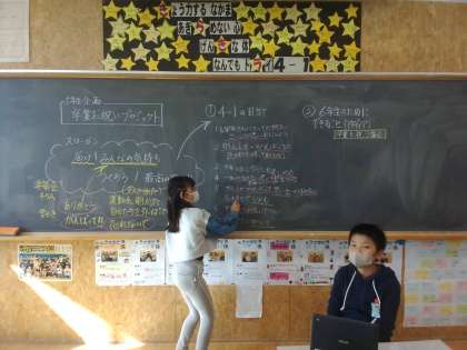 5年生が企画運営する「卒業お祝いプロジェクト」に向けて、自分たちのクラスではどんな目当てをもって取り組みたいかを話し合いました。