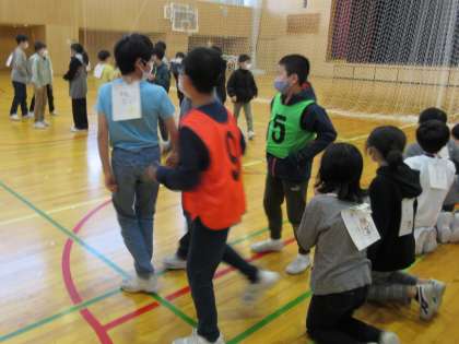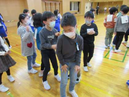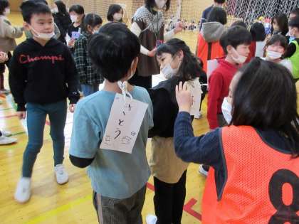 集会委員会の「なかまをさがせ!言葉合わせゲーム」という企画がありました。ゲームを通して学年のきずなを深めよう、という取り組みです。低、中、高学年に分かれて行われました。背中に貼られた言葉(本人にはわからない)と同じ仲間のペアを探すゲームです。お互いにヒントを言い合いながら次々にペアを見つけていきました。集会委員会のみなさん、楽しい企画をありがとうございました。