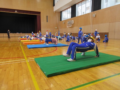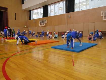 「くま」や「くも」などの生き物になりきってマットの上を移動しました。腕の力で体を支えることやマットに手のひら全体をつけることに気をつけながらマットでたくさん遊びました。