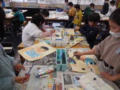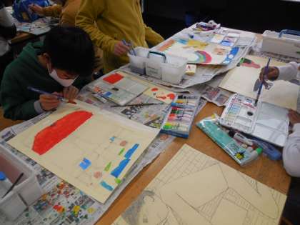 4年生は、水彩画の学習を進めています。思い出に残っている出来事とそのときの気持ちを絵で表そうと、一筆一筆ていねいに色をつけています。