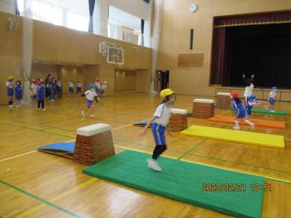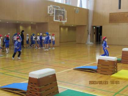 2年生の体育では、跳び箱がスタートしました。自分のレベルに合った段を選んで挑戦しています。上手な人をお手本にして、練習している姿が見られました。