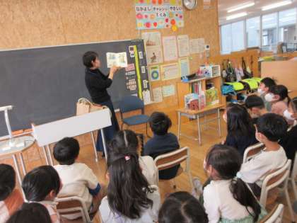 1組は「すんでみたいな こんないえ」、2組は「いそがしい よる」3組は「へんしん」をテーマにした絵本を6冊紹介してもらいました。笑ったり、驚いたり、興味をもって本の紹介や読み聞かせを聞き、終わった後も、本を手にとって読む子供たちの姿が見られました。