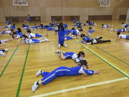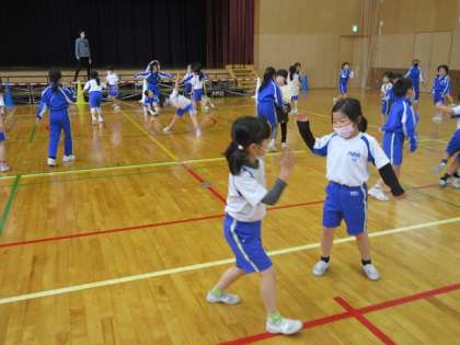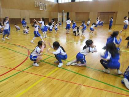 うさぎやへびなどの動物を想像しながら、体全体を大きく使って表現遊びをしました。友達と1匹の大きな動物になりきったり、向かい合って同じ動きをしたりなど楽しく運動できました。