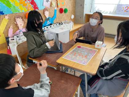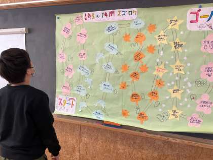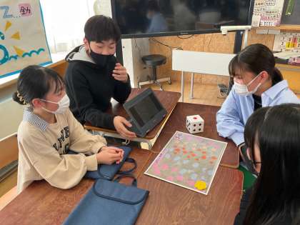 手作りのすごろく風ゲームにして、5年生と一緒に楽しみながら、6年生の1年間の生活や思いについて5年生に伝えました。各マスに書いてある出来事について6年生が詳しく話したり、5年生から質問をうけたりしました。「チャレンジ陸上記録会はね...」「1年生と交流するとはね...」「これは、あるあるなんだけど...」と、話に花が咲いていました。6年生の思いを5年生に受け継がれていきます。
